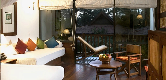 "Set among lush manicured gardens, this hotel has stylish wood and laterite rooms, each with their own hot bath or Jacuzzi along with Wi-Fi."