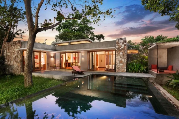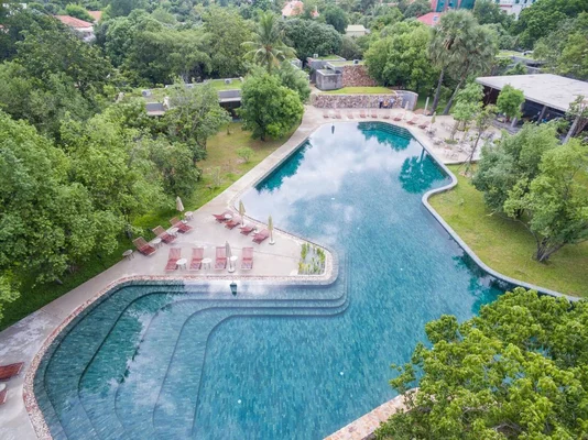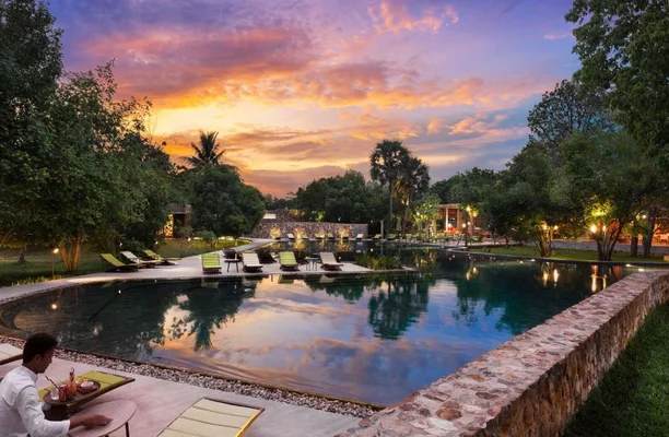 “Contemporary Cambodian architecture combined with lush greenery and an extravagantly large swimming pool makes this resort a refreshing base for visiting nearby Angkor Wat.”