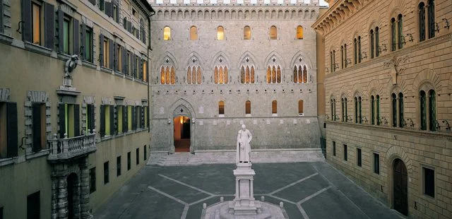“This trilogy of buildings was based on a single cult, the worship of money especially as now the three palaces today house the offices of the bank Monte dei Paschi.”