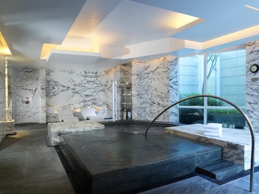 "Unwind before bed in the deep tub at the center of the mirror- and marble-filled bathroom, generously stocked with fluffy towels from Ploh."