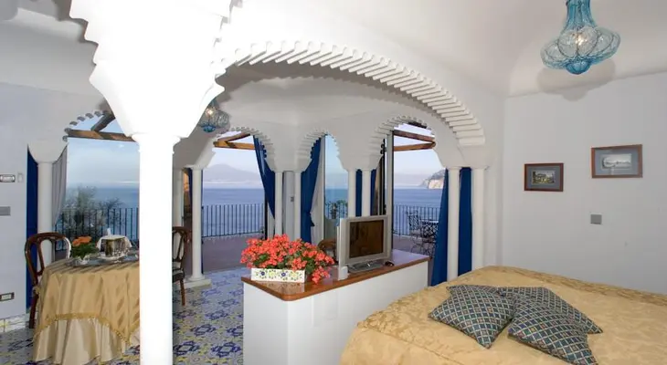 “On a clifftop outside Sorrento, this hotel is the former summer residence of a noble family. Lovely majolica floor tiles, vaulting, and antiques throughout, with wonderful views over the bay.”