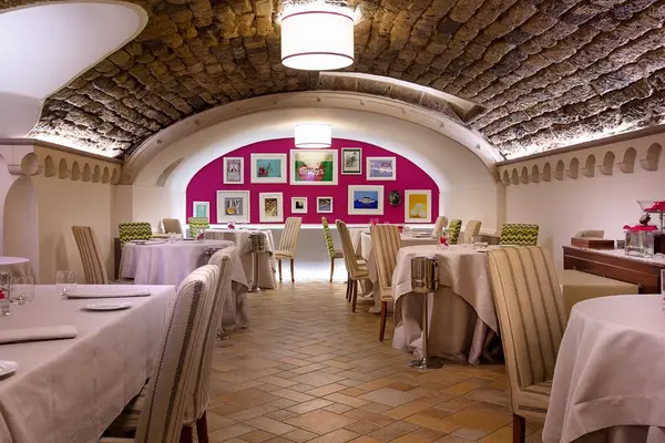 "Pressed cotton tablecloths, fresh flowers, and vaulted stone ceilings of the old cantine (cellars) make this a refined and atmospheric place."