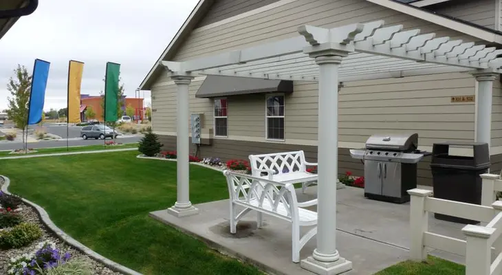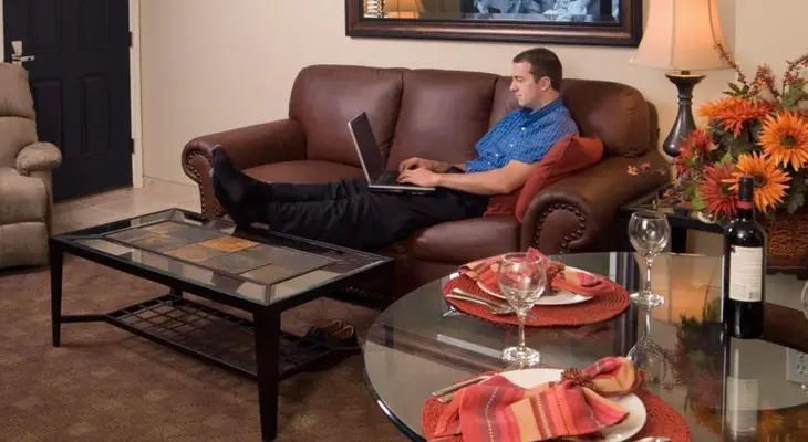 “Ten minutes from downtown, these spacious apartment-style suites have full kitchens, one or two bedrooms, and modern style and many amenities, including computers, printers, and fax machines in some.”