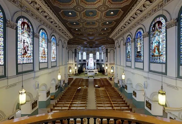 “Note the many stained-glass windows, side altars, and statuary.”
