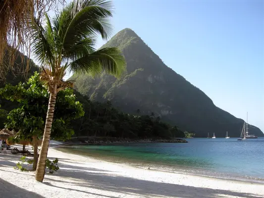 “The white sand on this crescent beach, snuggled between the Pitons, was imported years ago and spread over the natural black sand.”
