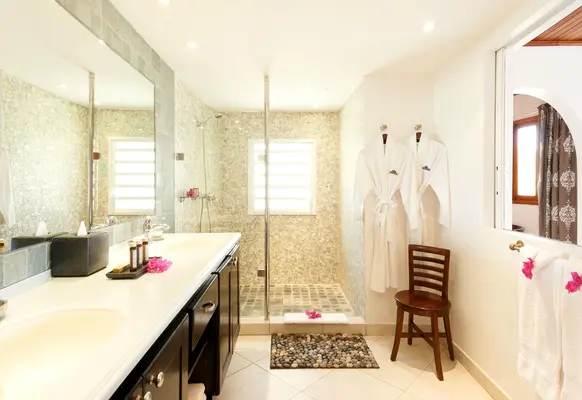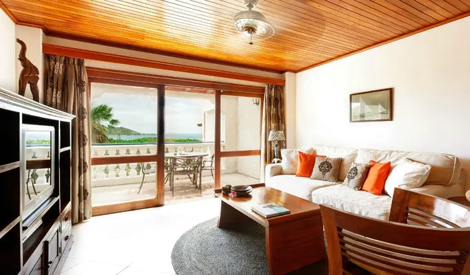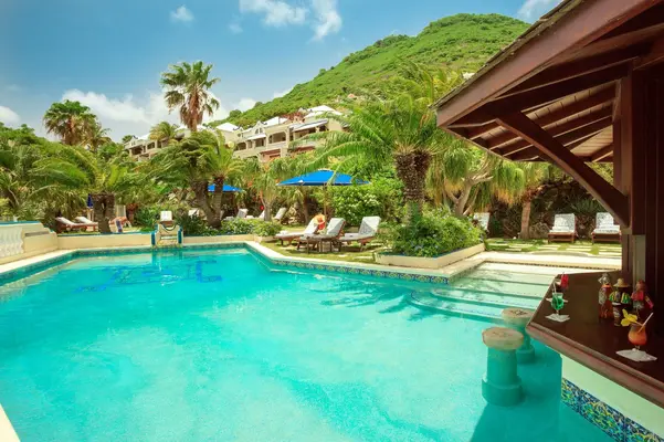 "On a hill above Grand Case, all units at this luxurious resort overlook the sea. Rooms are spacious and upscale with a full kitchen and private furnished terrace."