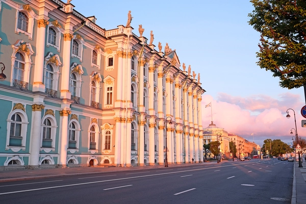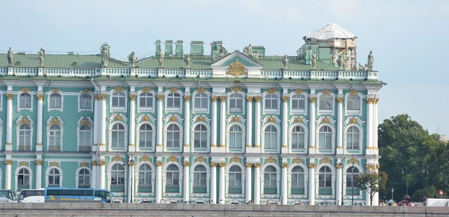 “The Winter Palace, seat of the Hermitage Museum since the October Revolution, is very impressive with its long pistachio green facade dotted with 400 immaculate white columns.”