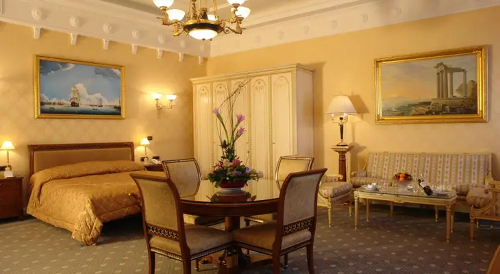 The hotel conjures up plenty of grandeur and romance: Guest rooms are awash in light-gold wall coverings, marble-topped furniture, and loads of inlay and ornate plasterwork. — Fodor's