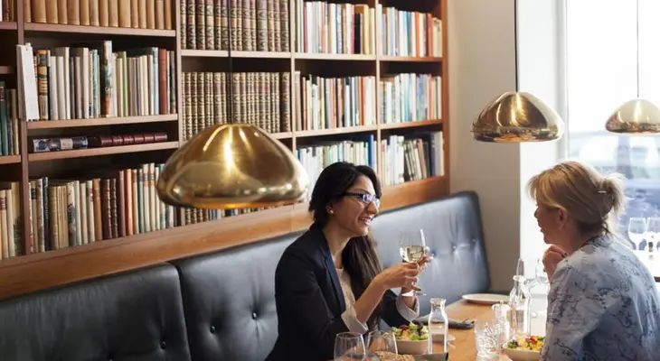 "Blond wood columns, squat leather chairs, and walls of vintage books provide a cheerful, retro entry to this boutique hotel in Ostermalam."