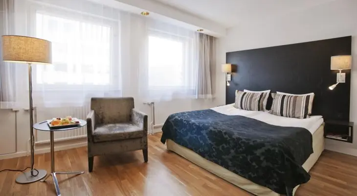 “Situated on a fashionable boulevard on the northern side of Humlegarden, this hotel is across the park from its livelier sibling Scandic Anglais, and a few blocks from the university.”