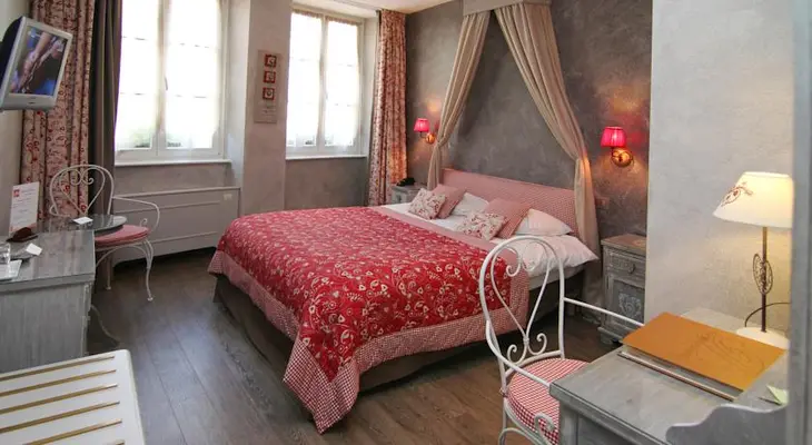 "Two 18C Alsatian houses built around a charming flower-filled patio. Very comfortable Alsatian-style or classic rooms, some with wooden beams, spa bathtub etc."