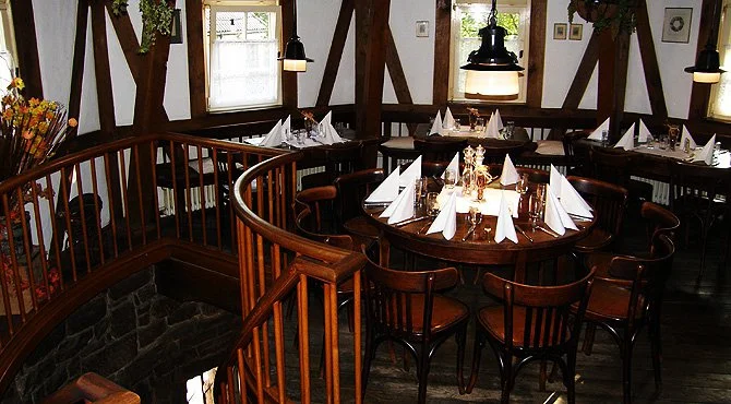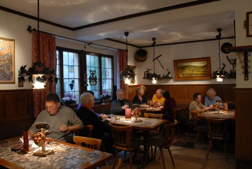 The interior of this restaurant celebrates German handicrafts that look handmade, from the handblown leaded glass in the small-paned windows to the carved columns and tables and chairs. — Frommer's