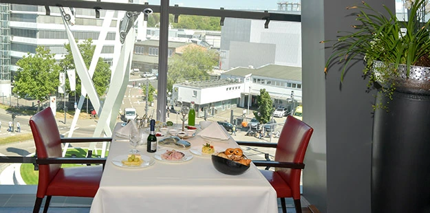 “Located on the top floor of a futuristic building, this restaurant serves seasonal cuisine focusing on prime cuts of US beef from the grill.”