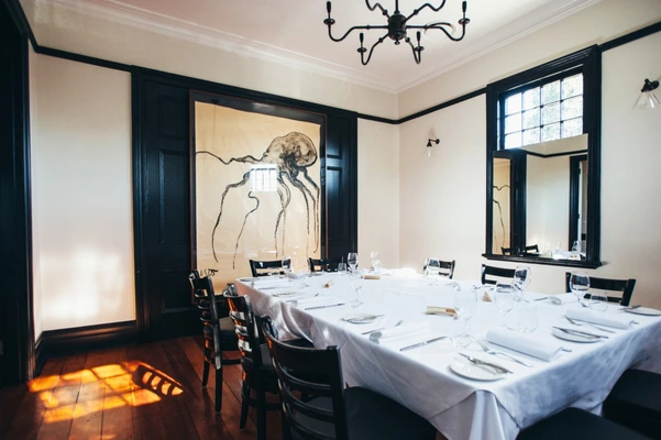 "An eye-catching painting of a giant squid greets diners to this hotel restaurant, which is now under the supervision of chef Colin Fassnidge who produces excellent French provincial cuisine."