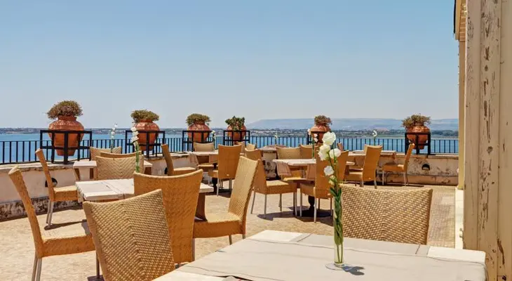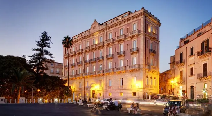 “This historic luxury hotel in central Ortygia faces a sandy beach. The hotel has two restaurants, one with a view of the coast and the other with a roof garden for alfresco dining.”