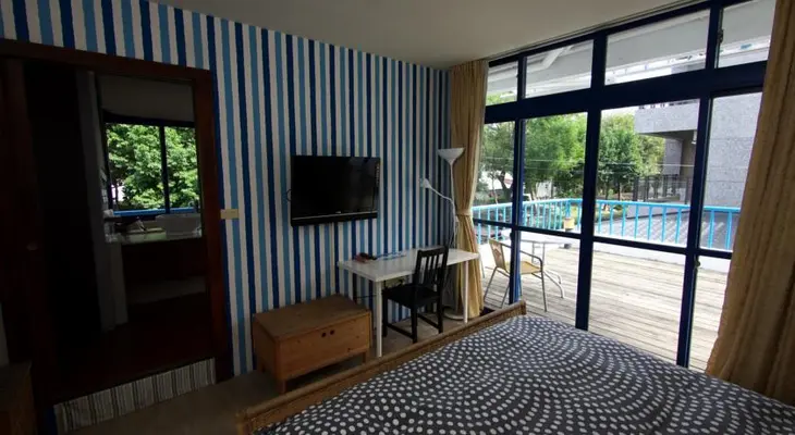 “Three plush rooms set in a modern two-storey house with a vaguely Mediterranean theme (red-tile bathrooms, small balconies and wrought-iron beds)... Free bikes.”
