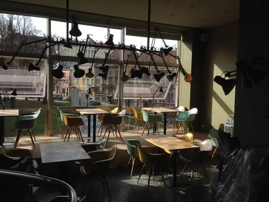 “This hip restaurant occupies three design-driven floors of a very cool Soviet-era building, with porthole-style windows and roughcast walls.”