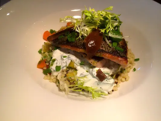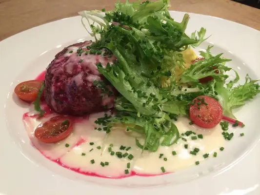 "Excellent dishes such as rabbit terrine with pistachios and red-currant marmalade are served in a space with red Jeff Koonsesque hanging lamps and a winding stainless-steel staircase." Full review