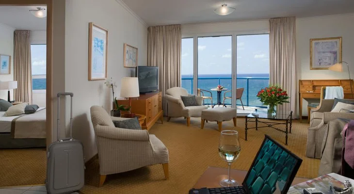 "Tel Aviv's newest (late 1990s) and by far most-luxurious all-suite hotel is located on the top 15 floors of a round, 30-story landmark skyscraper across the road from the beach." Full review
