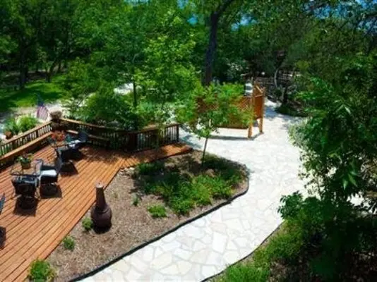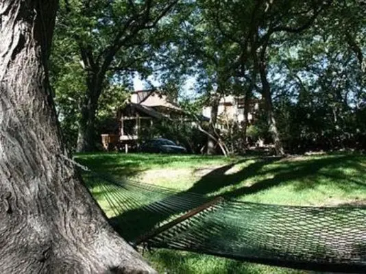 “The sprawling main house is shaded by pecan trees and wrapped in a series of wooden decks. Each guest room has a distinct style, with different color schemes and handmade bedspreads.”