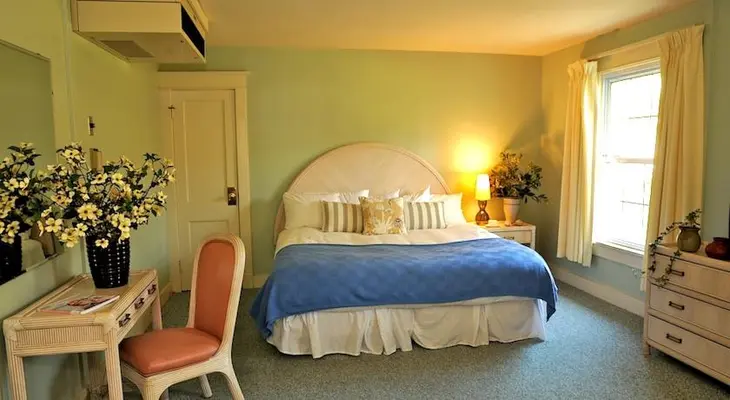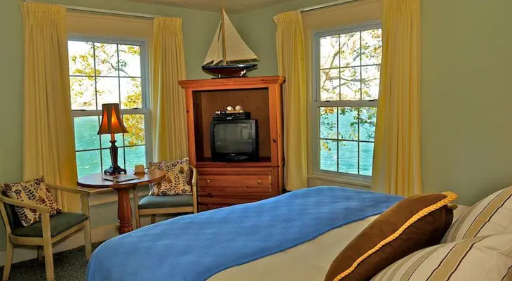 “Nestled on a prime piece of property surrounded by woods and fronting a small beach and the bay, this property has standard hotel rooms as well as private water-view cottages, some renovated in style.”