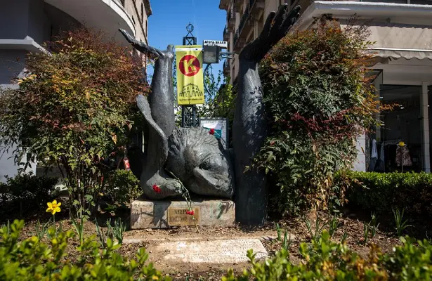 The murder precipitated the events leading to the 1967–74 dictatorship of the colonels. A dramatic bronze head and arm, above which flutters a sculpted dove, marks the spot. — Fodor's