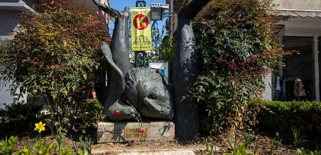 “The murder precipitated the events leading to the 1967–74 dictatorship of the colonels. A dramatic bronze head and arm, above which flutters a sculpted dove, marks the spot.”