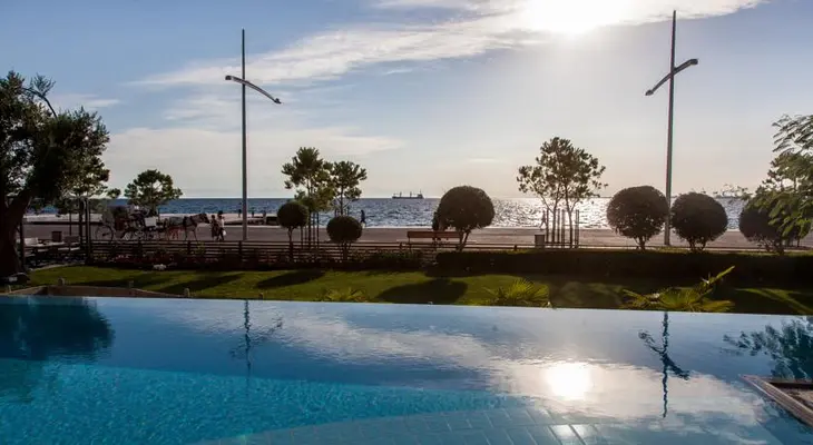 “A seaside hotel with 283 rooms, Makedonia Palace is located near in the city center and right in front of the sea.”