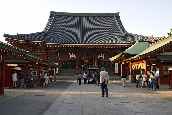 "Pass through the famous red gates (Kaminarimon) and walk up Nakamise Street along a row of small shops selling everything from tourist trinkets to traditional crafts."