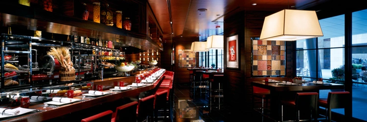 Black laquer, red accents, and floor-to-ceiling windows set the tone for French celebrity chef Joel Robuchon's Roppongi Hills venue. — Travel + Leisure