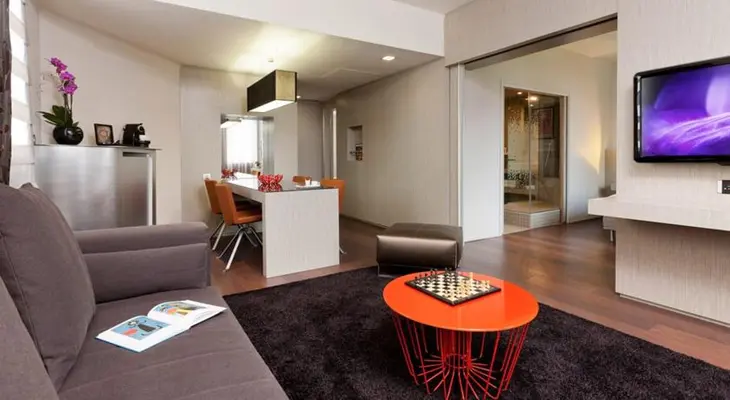 "Contemporary hotel slightly out of the city centre. Its refined style and hightech equipment assure its popularity with an international clientele."