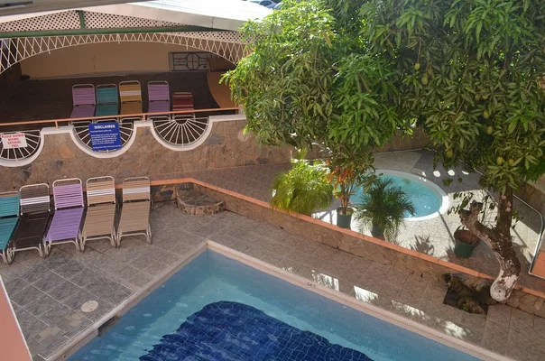 “Located on a quiet road close to the Savannah, all the rooms at this busy little hotel have wicker furniture, a/c, fridge, phone and cable TV.”