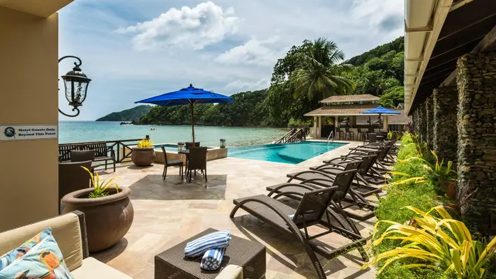 "Few tourists venture to the east end of Tobago, but that's where you'll find this secluded 46-acre beachfront resort on a bay that's always calm and safe to swim in."