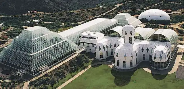 "Built to be completely sealed off from Biosphere 1 (the earth), Biosphere 2 is 3 acres of glass domes and pyramids containing six ecosystems: ocean, mangrove, rainforest, savannah, desert and city" Full review