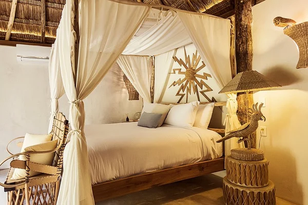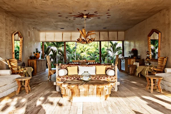 "Filled with furniture and artwork handcrafted in Mexico, the ambiance here is a mix of pure jungle glamour"