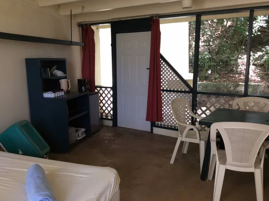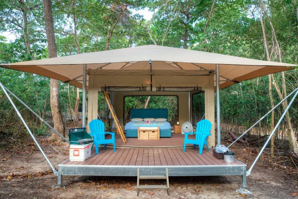 "Cottages are more or less a room with two concrete walls...canvas tents come with a floor and all cooking equipment. Bring your own tents and camping equipment to the primitive bare sites." Full review