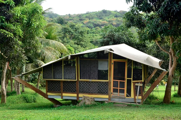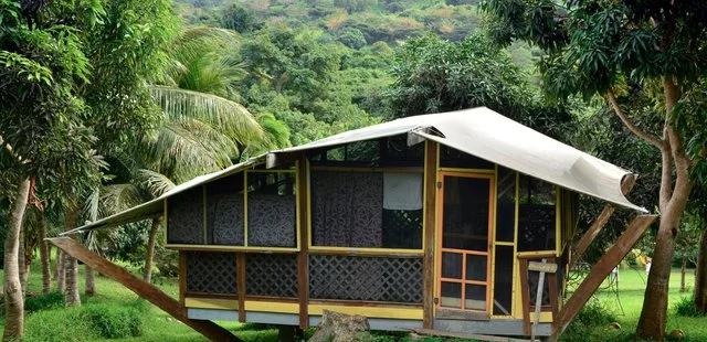 "Pitch your own tent in the forest, or choose one of four bungalows...Guests share the solar-heated bathhouse, pavilion with refrigerator and wi-fi, and sublime nature sounds. " Full review