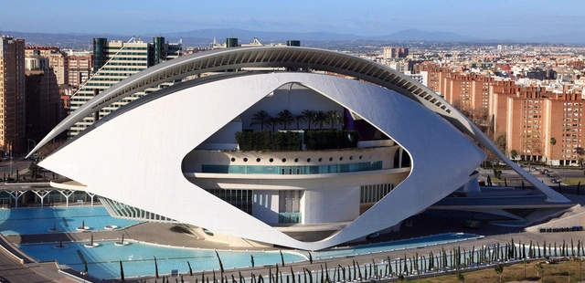 “This ultramodern arts complex, grafted onto the City of Arts & Sciences, has four auditoriums and enticing levels of plants poking out from under the ceramic exoskeleton.”