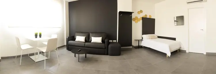 “Like many apartment-style hotels, it is short on features, and its 22 sparsely decorated, black-and-white units take minimalism to the extreme; nevertheless, they are roomy.”