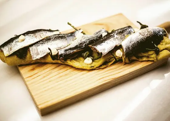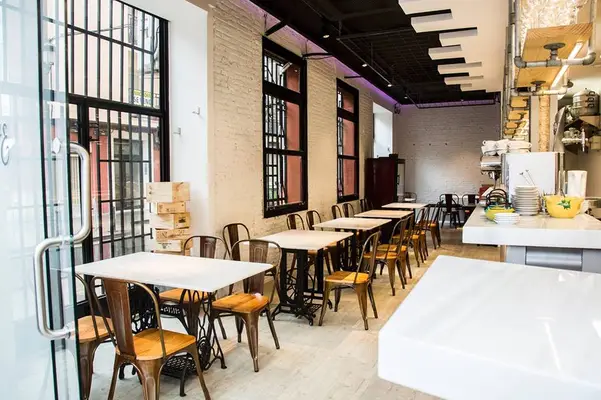 “Informal bistro ambience with an open-view kitchen and unusual tables made with the legs of old sewing machines. Seasonal, Mediterranean cuisine with a contemporary twist.”