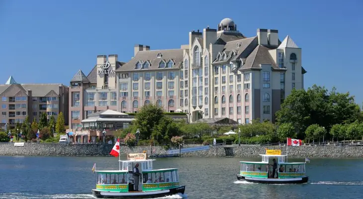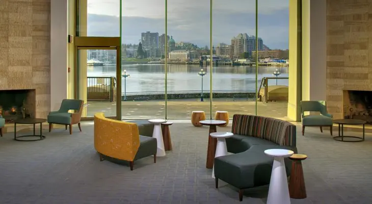 “Modern hotel with spectacular lobby boasting floor-to-ceiling windows overlooking Victoria’s famous Inner Harbour with only the boardwalk between the hotel and the water’s edge.”