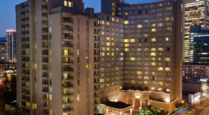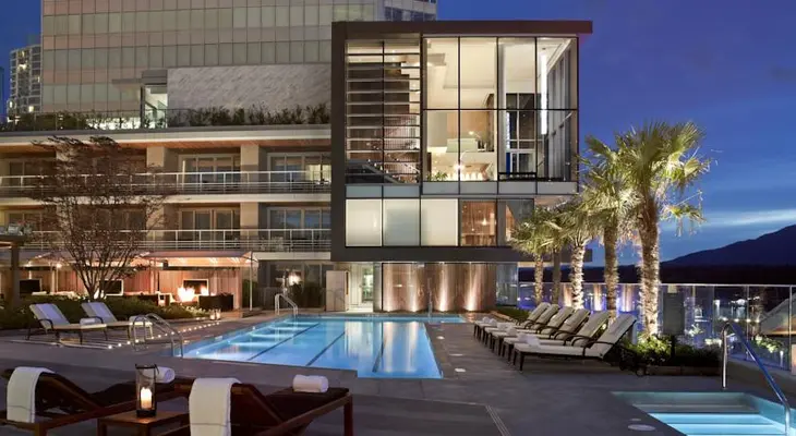 Located on the water in downtown Vancouver (next to the new convention center), this luxury hotel offers 377 guest rooms and suites with views of the North Shore Mountains. — Gayot