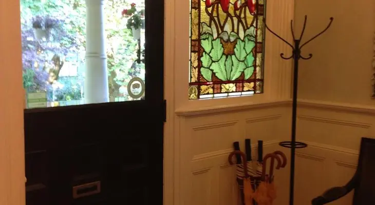 "Stained glass, fine antiques, and art-nouveau fixtures decorate this comfortable 1904 house a few blocks from Stanley Park." Full review