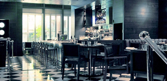 "This bold newcomer spares no expense combining classic Italian materials for a sleek, sexy reinterpretation, with playful touches like herringbone-patterned marble floor."