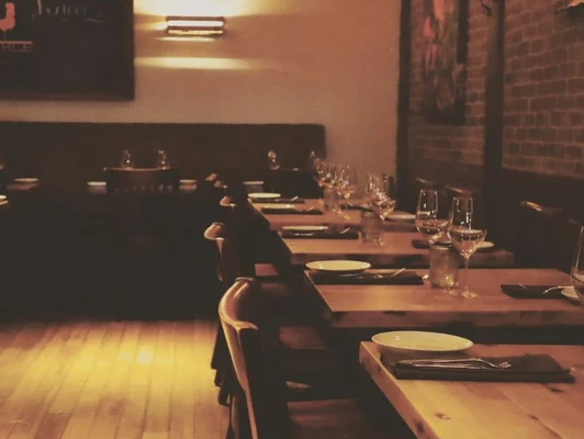 "The setting is lively and comfortable, with exposed red brick walls, wood furnishings and two varnished wood counters seating a handful of diners facing the open kitchen." Full review