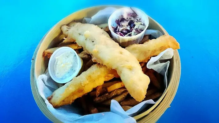Then tuck into some of Vancouverâs best Granville Island beer-battered fish ânâ chips (choose cod, halibut or salmon), oyster poâ boys, a char-grilled rare albacore tuna sandwich with sweet chili ponzu glaze, tomato âsnake biteâ salsa and wasabi mayo, or grilled salmon âtacones," all served with zesty Pacific Rim coleslaw.