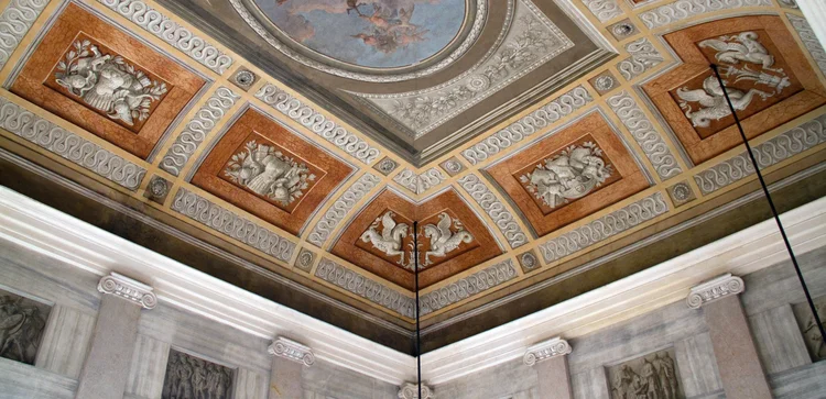 "The room is well preserved with massive gold frames embedded in the ceiling and a wall painting that achieves the paradoxical complexity that Raphael perfected in the Vatican. " Full review