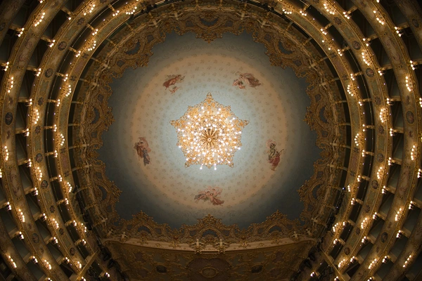 "Superb concert hall with its green ceiling, stucco work and caryatids, as well as its foyers lit by Murano chandeliers and decorated with phoenix-themed tapestries." Full review