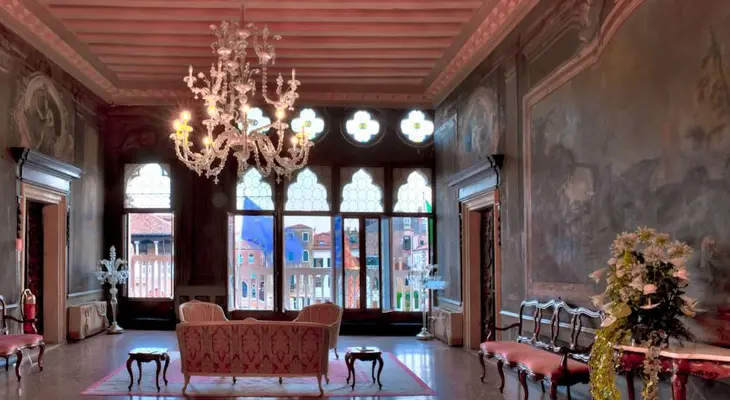 "Elegant 14th-century palazzo on the Grand Canal with ornate chandeliers and museum-worthy antiques."
