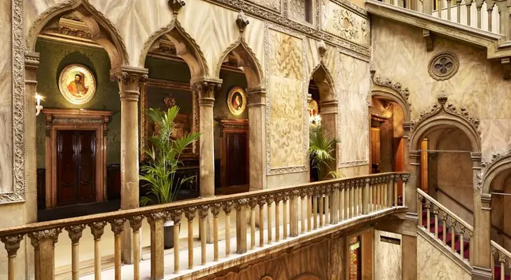 "The gilded lobby, with its Murano glass chandeliers, pink marble columns, and stained-glass windows, sets the opulent tone throughout." Full review